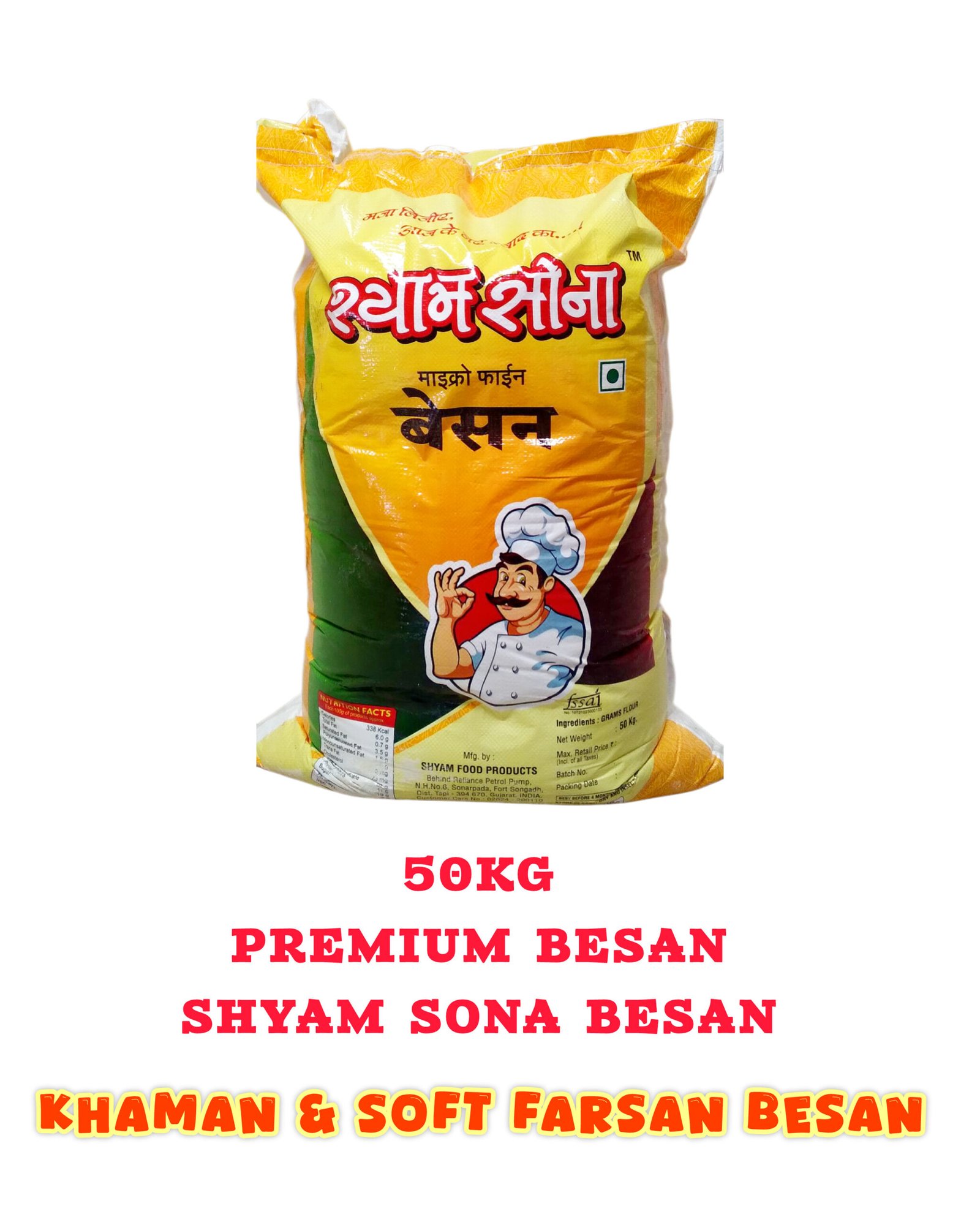 Shyam Sona is our second category . It is   “ Ultra-fine Besan. As using Shyam Sona besan in kitchen it consumes less Oil. It is Good for health.Shyam Sona besan is specially prepared  for Gathiya & Fafada
